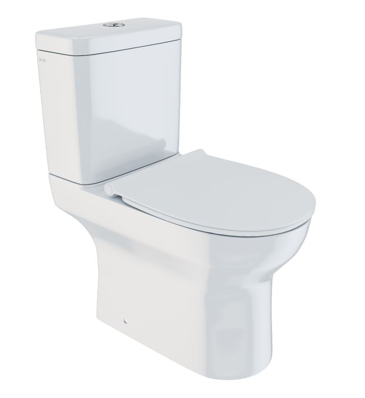Гигиеничный фарфоровый унитаз 640×380×755 мм с плавным закрытием, двойным сливом и горизонтальным выпуском для компактных санузлов.