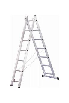 Двухсекционная алюминиевая лестница, 9 ступеней, высота 4,29 м – лёгкая, устойчивая и надёжная для работ внутри и снаружи помещений.