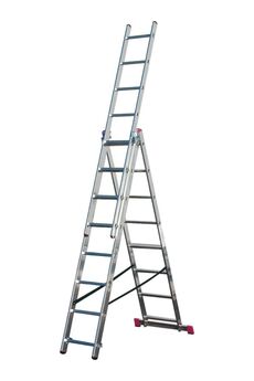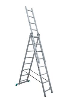 Алюминиевая 3-секционная лестница, 9 ступеней, высота до 5,94 м. Прочная, устойчивая, легкая, для работ внутри и снаружи помещений.