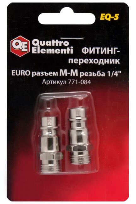 Фитинг-переходник EQ-5 Quattro Elementi - комплект из 2-х принадлежностей для компрессорного оборудования. Фитинги необходимы для подключения шланга к компрессору. Имеют стандартное соединение папа EURO и резьбу папа 1/4". Изготовлены из высококачественной стали, обеспечивают надежное крепление. Переходник евро-стандарт, резьба 1/4 дюйма, набор 2 шт., прочная латунь, для быстрого и надежного соединения пневмоинструмента.