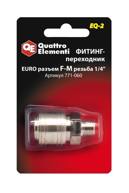 Фитинг-переходник EQ-2 Quattro Elementi - принадлежность для компрессорного оборудования. Служит для подключения шланга к компрессору. Фитинг имеет стандартное соединение мама EURO и резьбу папа 1/4". Изготовлен из высококачественной стали, обеспечивает надежное крепление. Быстросъёмный фитинг для надёжного и герметичного соединения EURO мама – 1/4" папа. Идеален для пневмоинструмента, устойчив к износу.
