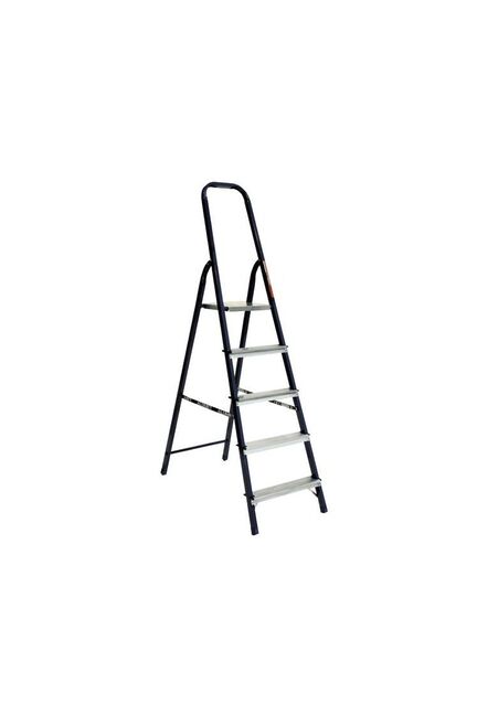 Семиступенчатая стальная стремянка, высота площадки 145 см, нагрузка до 150 кг, противоскользящие ступени, устойчива и долговечна.