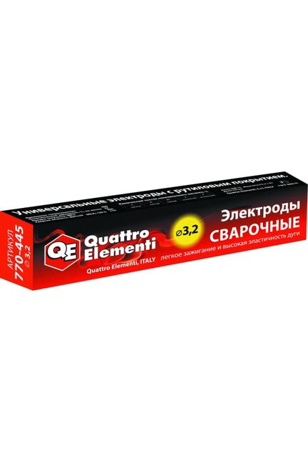 Электрод QUATTRO ELEMENTI предназначен для сварки методом MMA конструкций из низколегированных и малоуглеродистых сталей. В основе покрытия лежит минерал рутил, рутиловый концентрат, состоящий в основном из двуокиси титана. Применяется в машиностроении и строительстве. Электрод обеспечивает мощное и стабильное горение дуги. Не образует поры в швах при сварке сталей с окалиной и ржавчиной. Оптимален для сварки в любом положении, кроме вертикального сверху вниз.