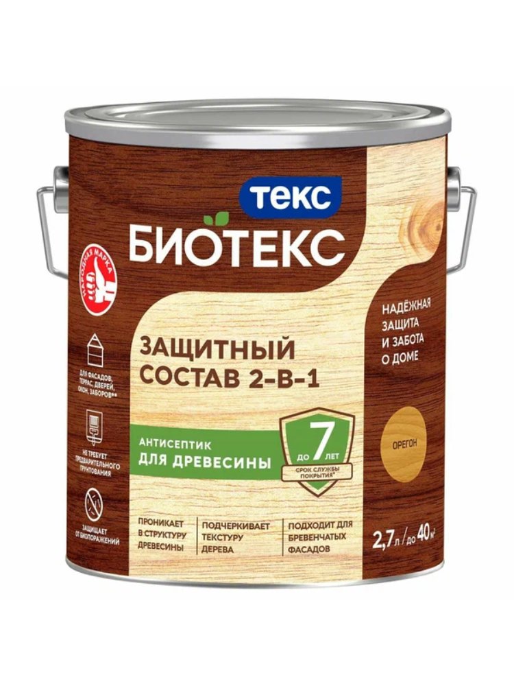 Для деревянных поверхностей из брёвен, вагонки, бруса, строганных и пиленых дощатых фасадов, термообработанной и пропитанной под давлением древесины снаружи помещений.Расход 12 - 17 м2/л по строганой и бревенчатой поверхности древесины; 7 - 9 м2/л по пилёной поверхности древесины. Разбавитель - Уайт-спирит. Время высыхания до отлипа – 1 час, следующий слой можно наносить через – 2 часа, полное – не более 24 часов Антисептик для дерева, защищает от влаги, плесени и УФ, яркий цвет «Орегон», объём 2,7 л, подходит для фасадов, заборов, садовых построек.