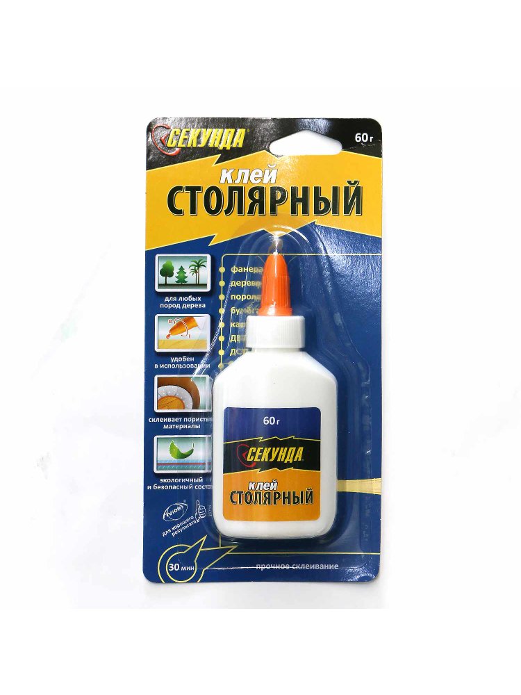 Столярный клей в упаковке 60 г, который идеально подходит для столярных, ремонтных, монтажных и декоративных работ. Он обеспечивает прочное сцепление различных пород древесины, ДСП, МДФ, а также применяется для склеивания бумаги, картона и текстиля. Незаменим для ремонта мебели, сборки интерьерных элементов и бытовых мелочей.