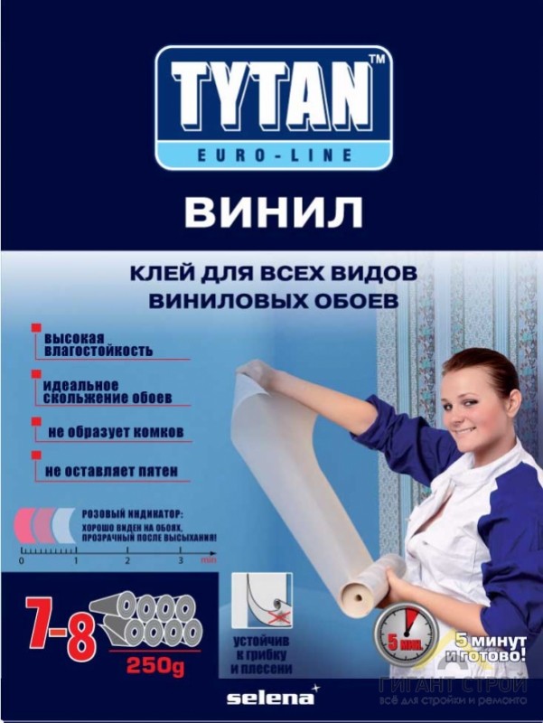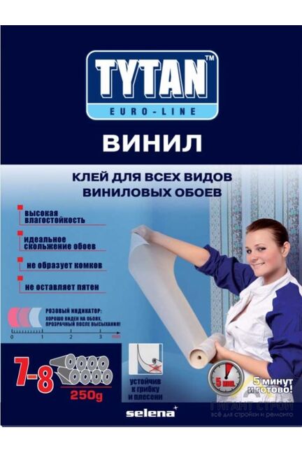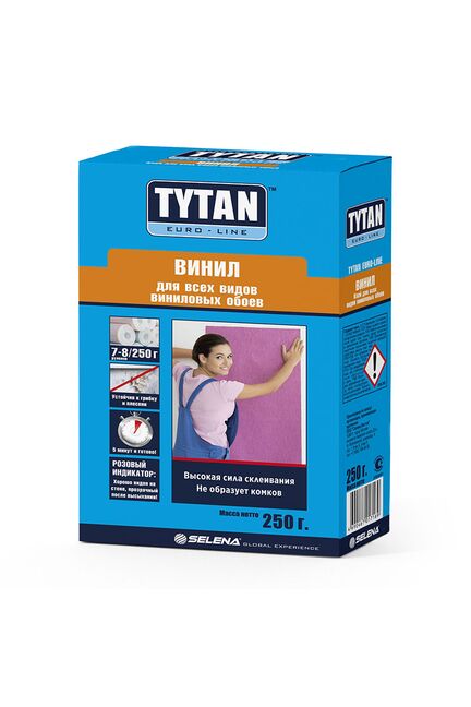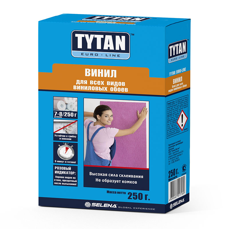 Tytan Euro-Line Винил - рекомендуется для всех видов виниловых обоев: стандартных и под окраску, легких и тяжелых, плоских, плотных, вспененных, структурных, рельефных, на флизелиновой основе, а также специальных (текстильных, шелкографии) и бумажных обоев. Клей изготовлен на основе модифицированных крахмалов европейского производства, антисептических и противогрибковых добавок и цветоиндикатора.