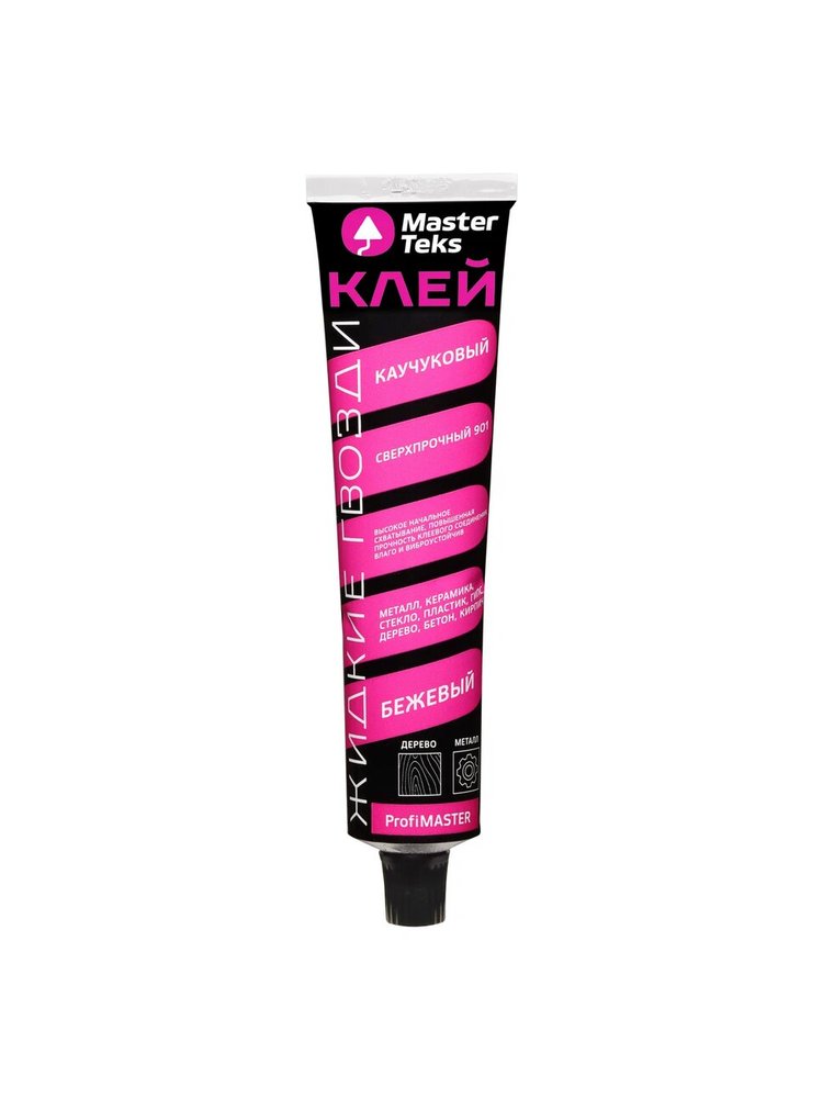 Клей каучуковый Жидкие Гвозди MasterTeks ProfiMaster 901 сверхпрочный Высокопрочный универсальный водонепроницаемый эластичный монтажный клей, применяется для наружных и внутренних работ, а также для работ во влажных помещениях ПРЕИМУЩЕСТВА: ● Очень высокое сцепление; ● Влаго и виброустойчив; ● Повышенная прочность клеевого соединения; ОБЛАСТЬ ПРИМЕНЕНИЯ: ● Предназначен для склеивания большинства строительных материалов: дерево, ДСП, ДВП, пластик, бетона, керамика, кирпич, гипс, металл, стекло в любом сочетании; ● Для крепления стеновых панелей, плинтусов, наличников, молдингов, декоративных элементов Термостойкость после отверждения от -20°C до +60°C Температура применения от +10°C до +30°C Сверхпрочный каучуковый клей: сильная фиксация, универсальность, влагостойкость, удобный тюбик 120 г, подходит для домашних и строительных работ.