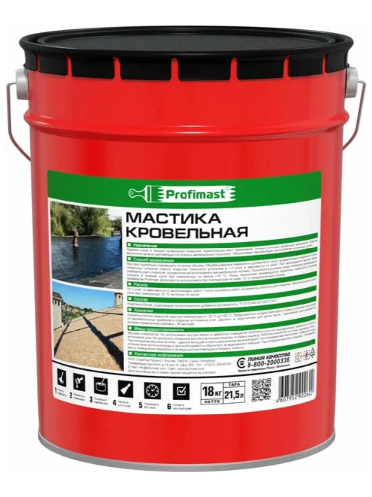 Кровельная мастика - состав на основе высококачественного кровельного битума, органического растворителя, пластификатора, наполнителя и гербицидной добавки. Рекомендуется использовать для заделки швов и трещин кровельных покрытий, герметизации мест примыканий, укладки рулонных кровельных материалов, обеспечения пароизоляции при устройстве кровельных систем. Для гидроизоляции кровли и фундамента, высокая адгезия, эластичность, расход 18 кг на 21,5 л, готова к применению, устойчива к осадкам.