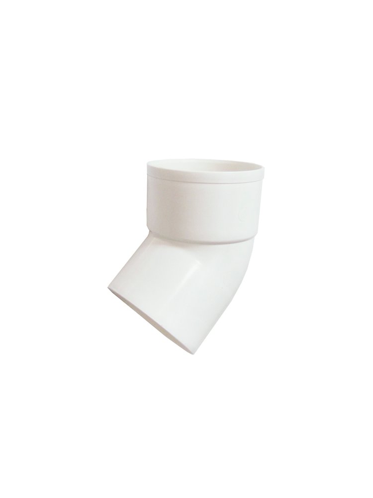 Обеспечивает отвод воды из системы на землю. Герметичный отвод 45° для труб 80 мм, белый, износоустойчивый пластик, легкий монтаж, защищает фасад и фундамент от осадков.