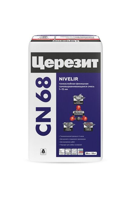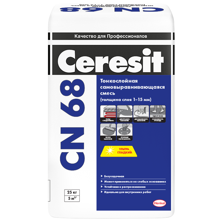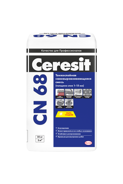 Самовыравнивающаяся смесь Ceresit CN 68 предназначена для выравнивания бетонных, цементно-песчаных, ангидритных и гипсовых горизонтальных оснований под укладку керамических плиток, линолеума, ковролина, ламината и других напольных покрытий, кроме паркета, в сухих помещениях с низкими механическими нагрузками (жилых, бытовых, административных, общественных и т.п.). Может применяться на основаниях с пониженной прочностью. Предназначена как для ручного, так и для механизированного нанесения. Смесь можно наносить слоем толщиной от 1 до 15 мм.
