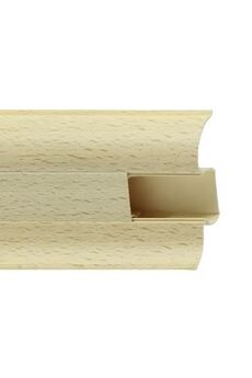 Утонченный и высокий профиль (58 мм) с острыми краями. Благодаря съёмной панели монтаж электрических проводов, покраска стен, оклеивание обоями возможны без демонтажа профилей. Конструкция позволяет монтировать и демонтировать плинтус без использования инструментов. Существует возможность размещения большого количества проводов, в том числе после монтажа. Специальная двухслойная технология: помимо слоя краски, дополнительно покрывается специальным лаком, благодаря чему его покрытие становится однородным, а это дополнительно защищает изделие от разного вида механических повреждений и вредного воздействия лучей УФ. Благодаря эластичному материалу, плинтус идеально прилегает даже к неровностям стен и полов. Высокий ПВХ-плинтус 58 мм, длина 2,5 м, натуральный бук, для маскировки кабелей и эстетичного завершения пола в любых интерьерах.