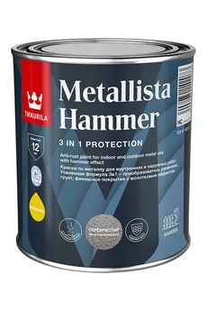 Краска для колеровки по ржавчине Tikkurila Metallista Hammer - специальная атмосферостойкая краска по ржавчине для внутренних и наружных работ. Сочетает в себе свойства преобразователя ржавчины, антикоррозионной грунтовки и декоративного финишного покрытия с молотковым эффектом. Позволяет легко проводить окраску металлических поверхностей без тщательной очистки от ржавчины и дополнительного использования грунтовки. Воск в составе материала создает барьер и защищает от проникновения влаги к металлу. Антикоррозионные компоненты краски взаимодействуют со ржавчиной и не дают ей распространяться дальше, надежно защищая металлическую поверхность на длительный срок. Отличная износостойкость. Стальные и чугунные конструкции, садовая мебель, гаражи, ограды, решетки и т.п. Не предназначена для полов и лестниц. Возможно применение в детских дошкольных учреждениях и помещениях административной группы, лечебно-профилактических учреждениях. Одновременное преобразование ржавчины, грунтовка и стойкое покрытие,  для мета