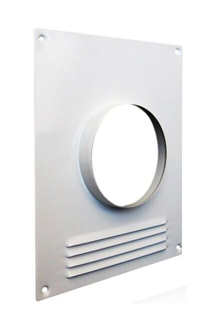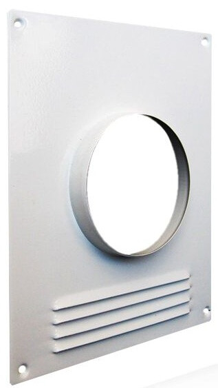 Площадка торцевая пластиковая с решеткой: предназначена для оформления вентиляционных отверстий и присоединения воздуховодов; настенный монтаж при помощи шурупов; материал: полистирол; размеры: высота 24см, ширина 20,5см, раст.между отверстиями креплений: вертик.22,4см, горизонт.18,4см,Φ внутр.отверстия 10см, цвет: белый; Площадка 180×240 с решёткой и фланцем d=100 для вентиляции, надёжно защищает от мусора и влаги, устойчива к коррозии, подходит для фасадов и стен.