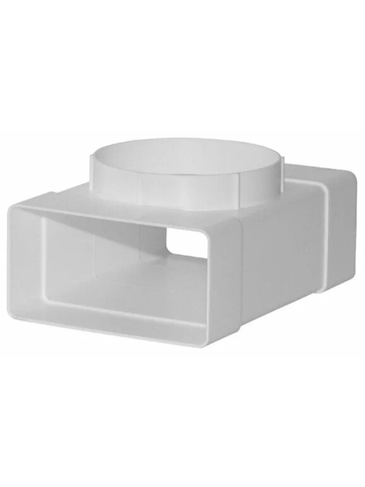 Соединитель плоских воздуховодов с выходом на фланцевые воздухораспределители: применяется для разветвления вентиляционной сети, сонтируется с воздуховодом; ширина 204мм, высота 234мм, Φ160мм, цвет белый Универсальный Т-образный соединитель для плоских каналов 60×204 с выводом на D160, обеспечивает герметичное и компактное соединение воздуховодов.