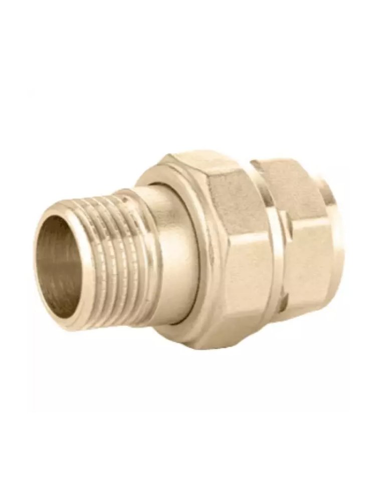 Герметичное соединение труб Ду 25, латунь с никелем, ВР–НР, выдерживает до 10 бар, устойчива к коррозии, подходит для водоснабжения и отопления.