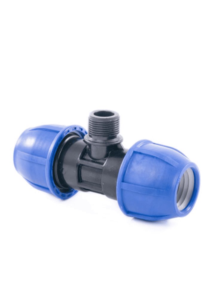 Компрессионный тройник PN16 d25×1 – надёжное разветвление ПЭ труб с резьбовым соединением для систем водоснабжения, давление до 16 бар.