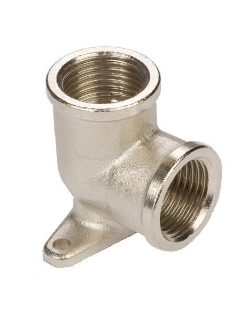 Прочный и надежный уголок с внутренней резьбой Ду 15 и креплением, покрытый никелем, обеспечивает удобное соединение труб под углом 90° и легкий монтаж в системах отопления, водоснабжения и сантехники.