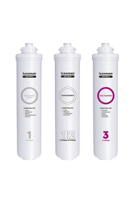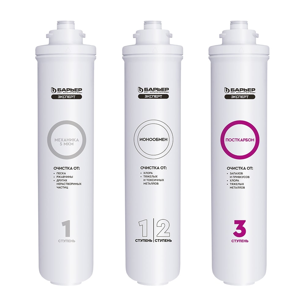 Комплект кассет БАРЬЕР EXPERT Standard помогает надежно защищать от крупных механических частиц, активного хлора, ионов тяжелых и токсических металлов.