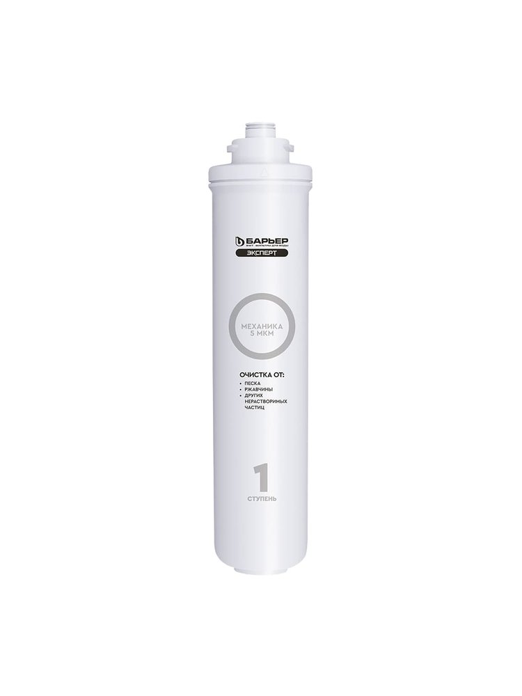 БАРЬЕР ЭКСПЕРТ Механика - картридж предварительной очистки. Удаляет механические загрязнения, песок, ржавчину и других взвеси. Тонкость фильтрации 5 мкм. Совместим с любым фильтром из семейства БАРЬЕР ЭКСПЕРТ, БАРЬЕР WaterFort OSMO - выполняет роль первой ступени. Картридж заменяется удобно, одним движением, без специальных инструментов. Технология Smart lock обеспечивает защиту от протечек. Ресурс — 10 000 л. Производительность 2 л/мин. Задерживает частицы до 5 мкм, совместим с EXPERT, до 10 000 л ресурса для защиты техники и систем водоснабжения в быту и строительстве.