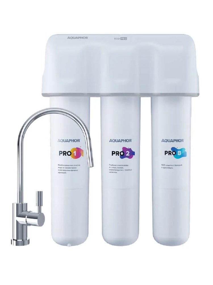 Cистема для глубокой очистки воды от химических примесей, бактерий, ржавчины и других растворенных и механических загрязнений. Многоступенчатая фильтрация ECO Pro включает инновационный модуль предочистки 2 в 1 с увеличенным ресурсом, сорбционные карбонблоки во всех трех картриджах и ультрафильтрационную половолоконную мембрану. Система оснащена новым коллектором с дополнительным уровнем безопасности. Абсолютная антибактериальная защита обеспечивается без применения химических бактерицидов. На стадии ультрафильтрации половолоконная мембрана удаляет бактерии и цисты микроорганизмов, некоторые из которых устойчивы к хлору и кипячению. Модель ECO Pro cохраняет исходный минеральный состав воды. Трёхступенчатая система фильтрации, до 8000 л ресурса, удаляет бактерии и примеси, быстрый монтаж и лёгкая замена картриджей.